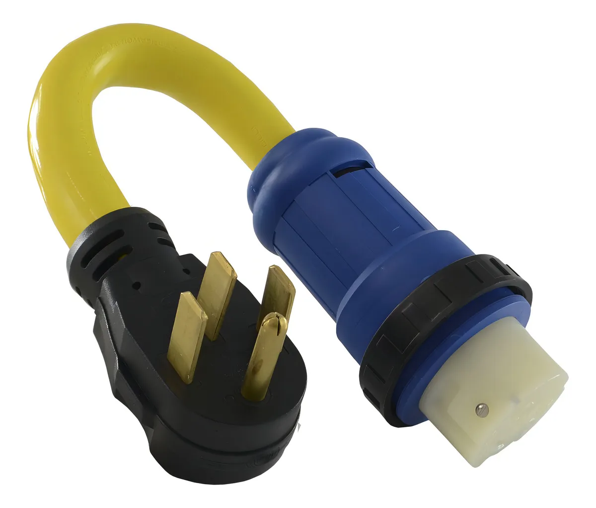 Adaptador RV [MARCA: Ejemplo] modelo X500 de 1.5 pies, con capacidad de 50A a 125/250V. Cuenta con un conector hembra de bloqueo para una conexión segura y estable. Ideal para conectar tu RV a fuentes de alimentación externas en campamentos, parques y otros lugares.