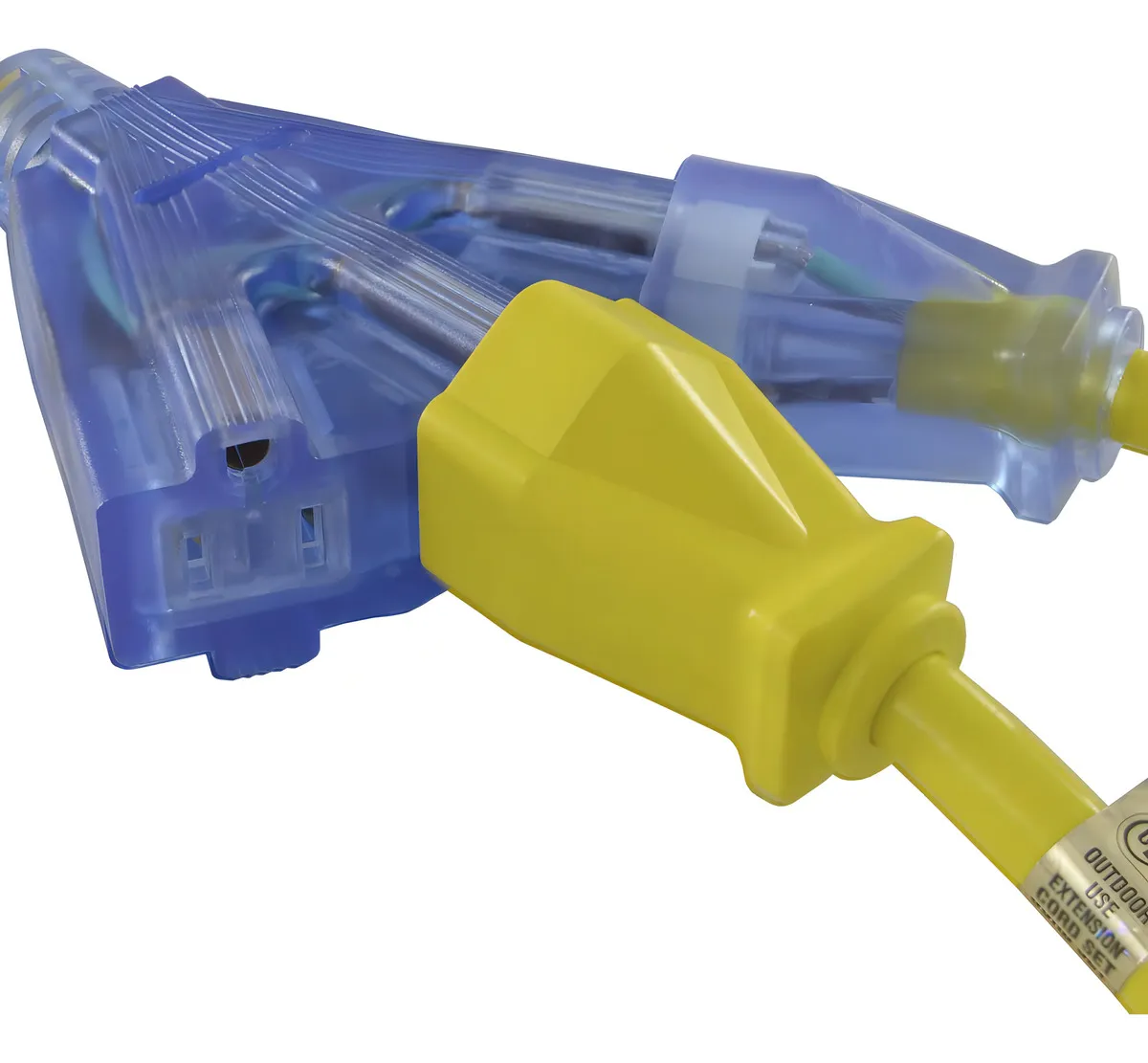 Cable de extensión industrial de 1.5 pies con 3 salidas y tapón de bloqueo. Ideal para uso rudo en talleres y obras. Ofrece conexión segura y confiable para herramientas eléctricas.