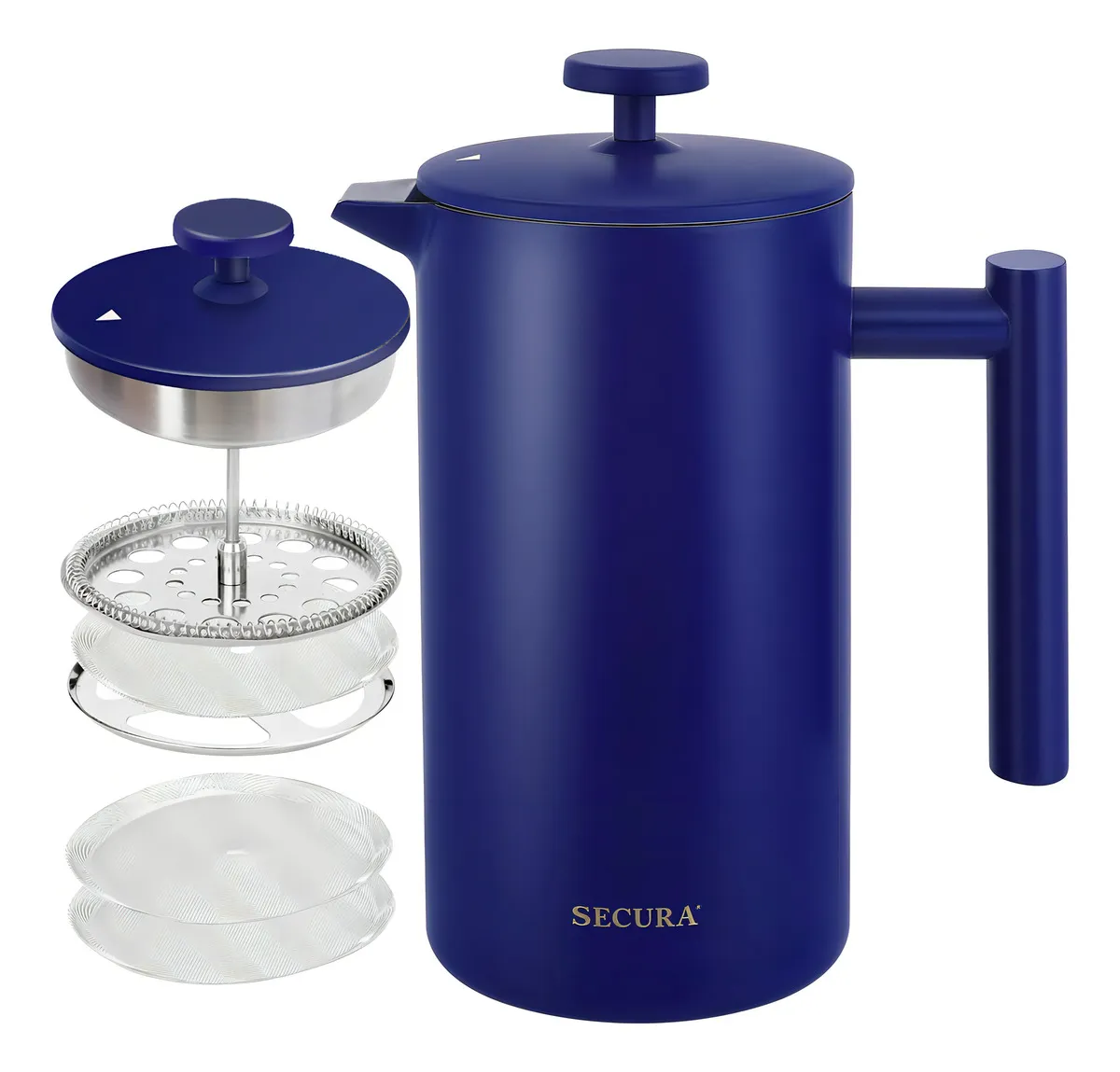 Cafetera de Prensa Francesa 1 Litro OXO Good Grips: Acero Inoxidable Azul, Doble Pared Aislante, Filtro de Acero Inoxidable, Fácil Limpieza – Disfruta