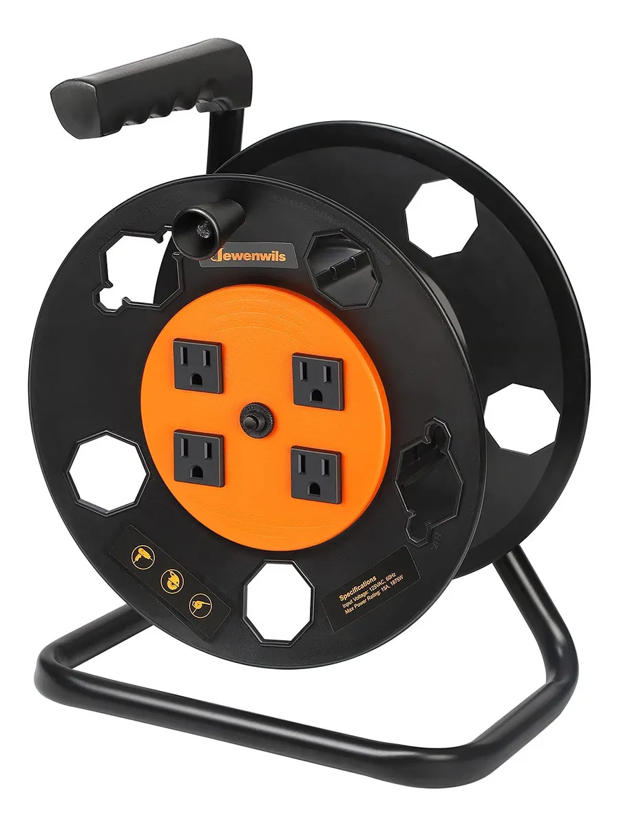 Amplia aplicación: el carrete de cable proporciona una alta capacidad, soporta hasta 100 pies de cable de calibre 14 o 16, 85 pies de cable de calibre 12, soporte verticalmente ocupando menos espacio. Solución de energía perfecta para cochera, patio trasero, espacio de almacén, etc.