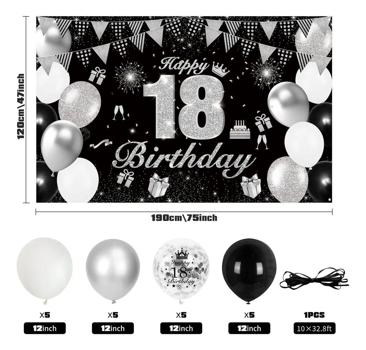 Kits de globos de pancarta de 18 cumpleaños Recibirás 1 pancarta extra grande de 18 cumpleaños, diseñada con color negro y plateado 5 globos negros de 12, 5 globos plateados de 12, 5 globos plateados de confeti de 12, 5 globos blancos de 12.