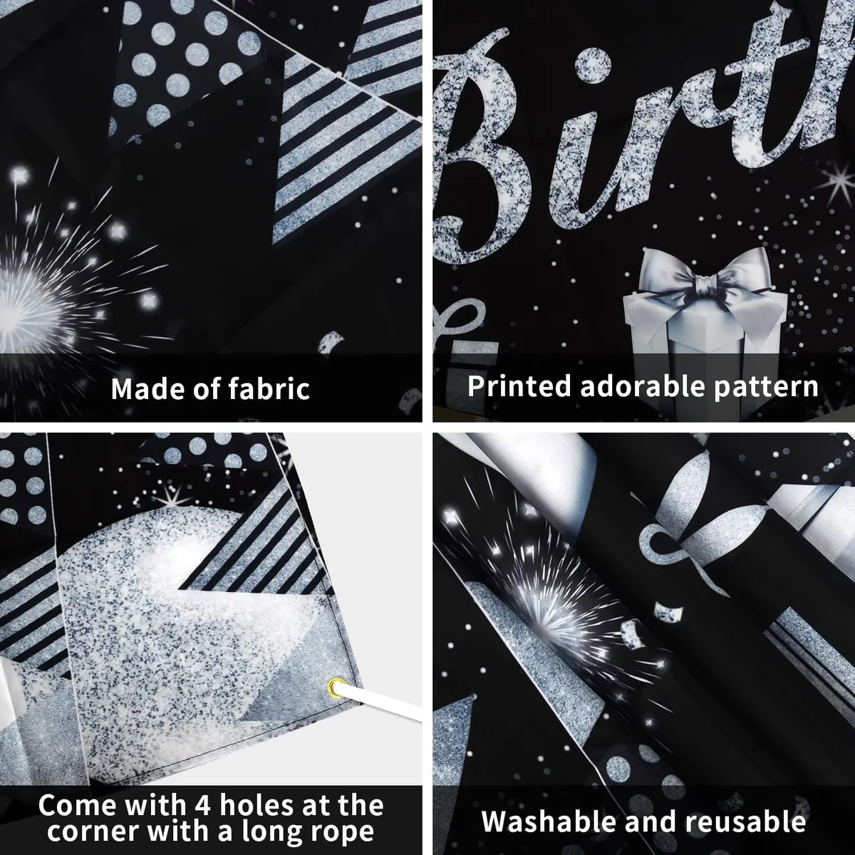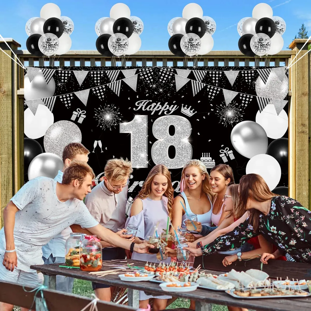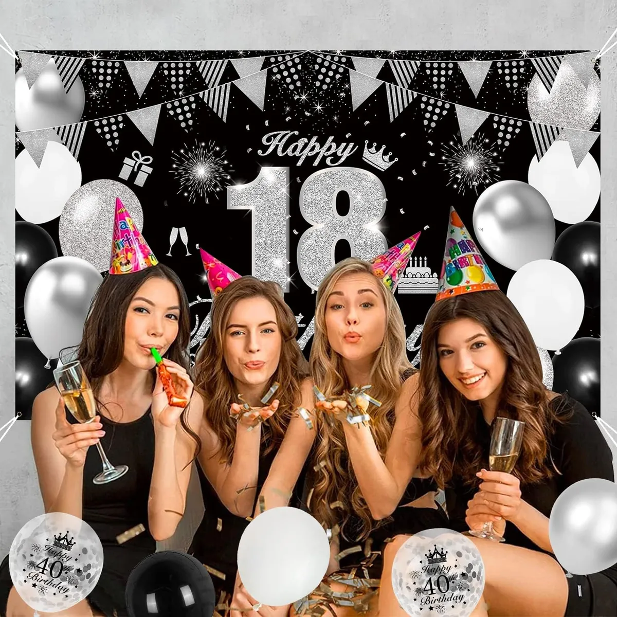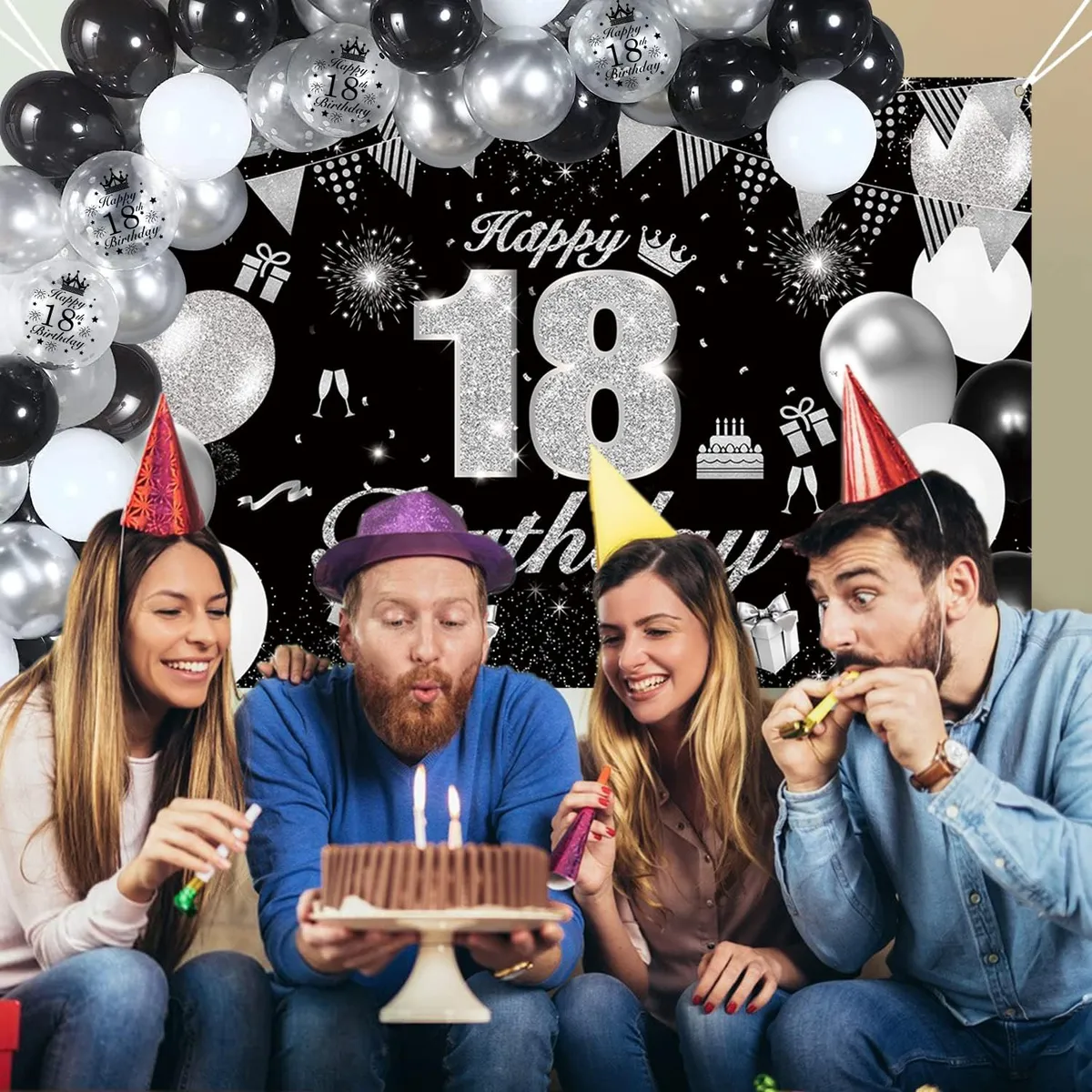18 Años Decoracion Cumpleaños Negro Plata, 18 Años Grande Póste Pancarta Feliz Cumpleaños Fondo Foto y 18 años Globos Cumpleaños, Póster de Tela Cartel Grande para Hombre Mujer Cumpleaños
