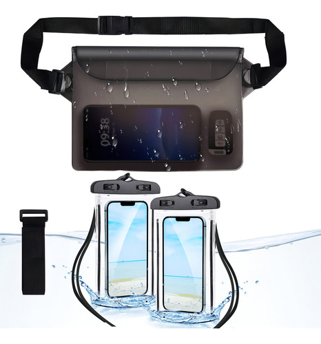 Kit de 3 piezas: funda impermeable universal para dispositivos móviles, cámara o similar + cangurera sumergible para objetos pequeños y llaves. Color negro, diseño versátil y resistente al agua. Ideal para actividades al aire libre y deportes acuáticos.