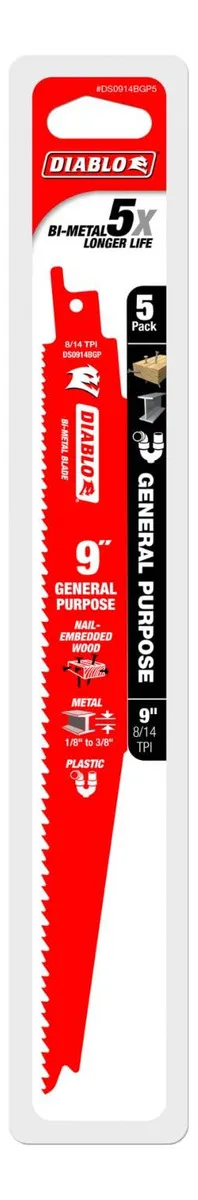 Paquete de 5 hojas recíprocas DIABLO de 9 pulgadas. Diseñadas para cortes rápidos y precisos en metal y madera. Ofrecen larga duración y un rendimiento superior.