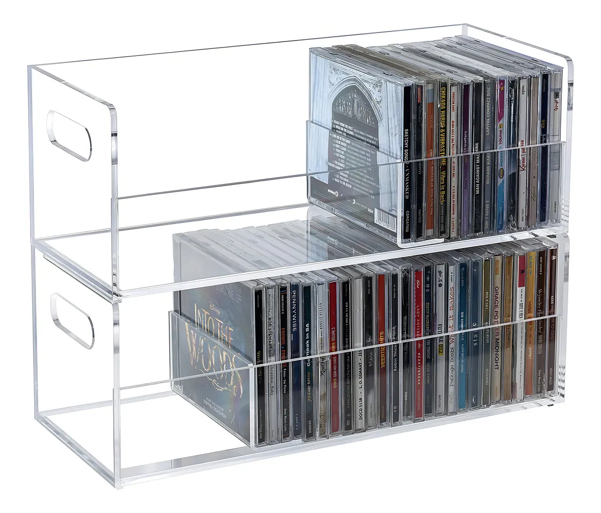 Caja para la organización de CD, hecha de acrílico transparente de primera calidad; tiene asas entrecortadas y es apilable.
