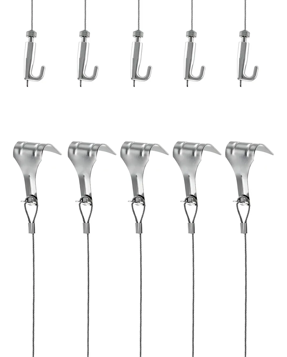 ¿Cansado de que tus cuadros se caigan y dañen tus paredes? Con el set de ganchos y alambre [Nombre de la Marca], olvídate de preocupaciones. Su diseño en acero inoxidable garantiza durabilidad y resistencia, permitiéndote colgar tus obras con total seguridad y estilo.