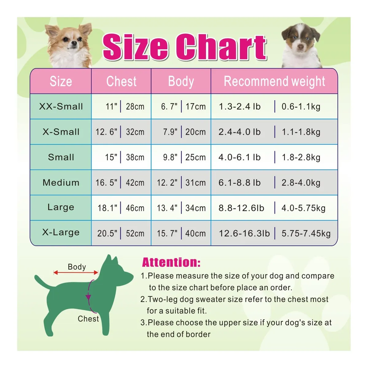 Nuestro suéter para perros se adapta a perros pequeños y otros animales pequeños, como gatos. Antes de realizar su pedido, tómese un momento para revisar cuidadosamente nuestra información de tallas. Recuerda, no elijas la talla en función de tu talla habitual. Mide la circunferencia del pecho y la longitud de la espalda de tu mascota, luego selecciona la talla correcta usando nuestra tabla de tallas.