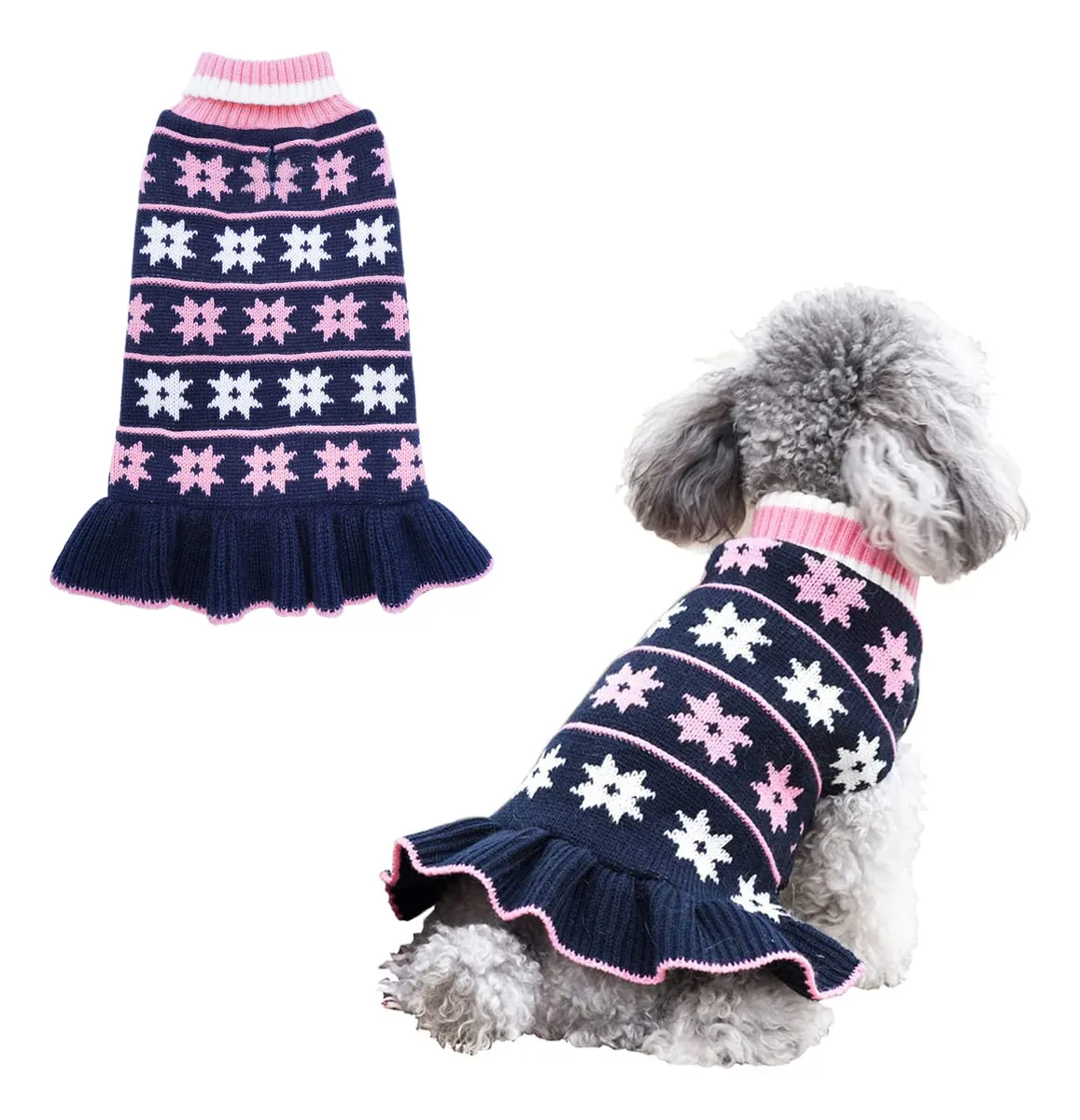 Descubre el Suéter Vestido para Perro Pequeño con cuello alto y diseño de copo de nieve azul marino. Ropa de invierno para mascotas.