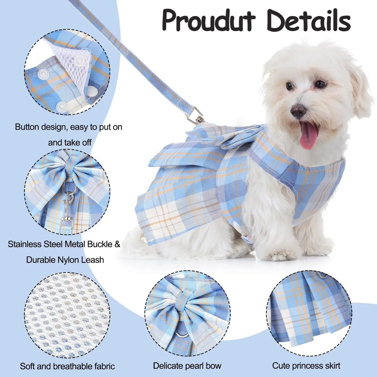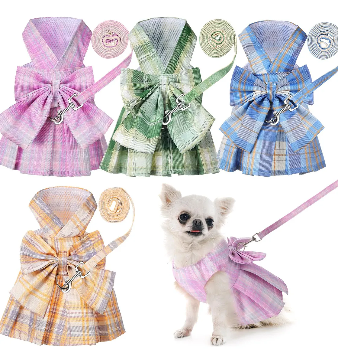 Conjunto 4 piezas vestido perro a cuadros con lazo y arnés. Moda canina elegante y cómoda para paseos y eventos. ¡Consiente a tu mascota!