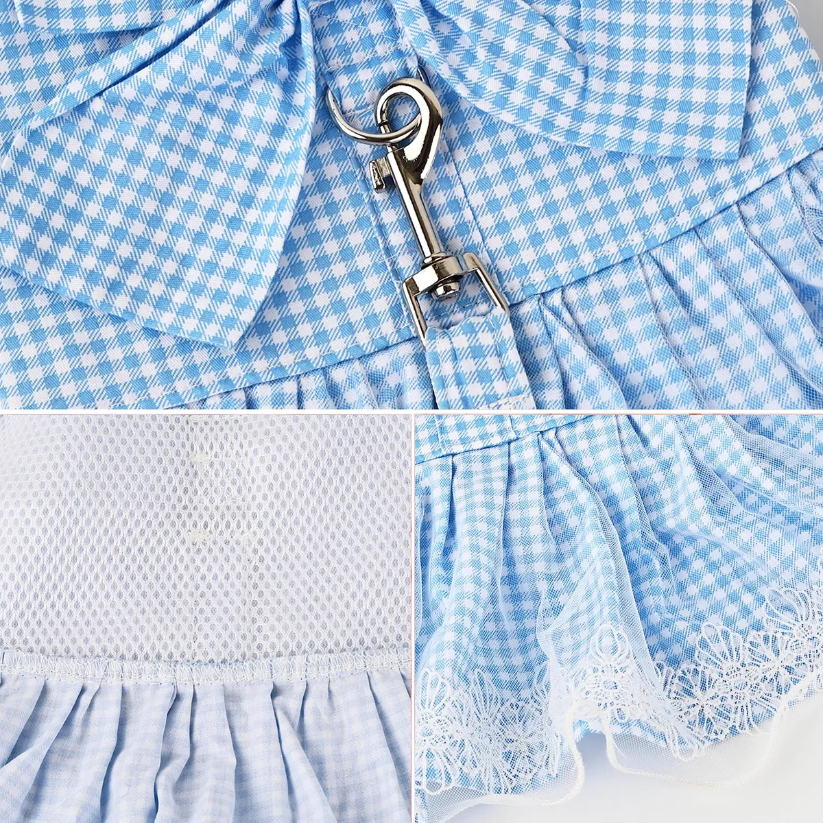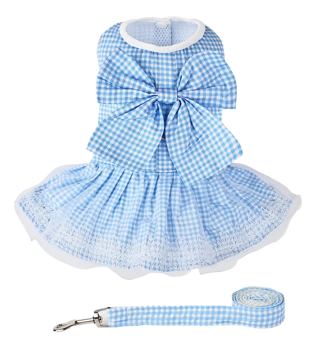Vestido de perro a cuadros con lazo, bonito vestido para perros pequeños, gatos, cachorros, con correa de arnés azul, L